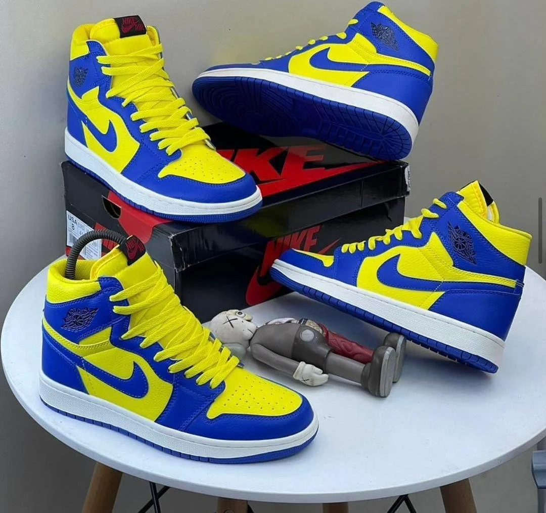 Nike Air Jordan 1 High-top basketball 🏀 shoe Royal Blue and yellow; yellow laces// Available Colors: Yellow/Royal Blue// Available Sizes: UK 39 — UK 46