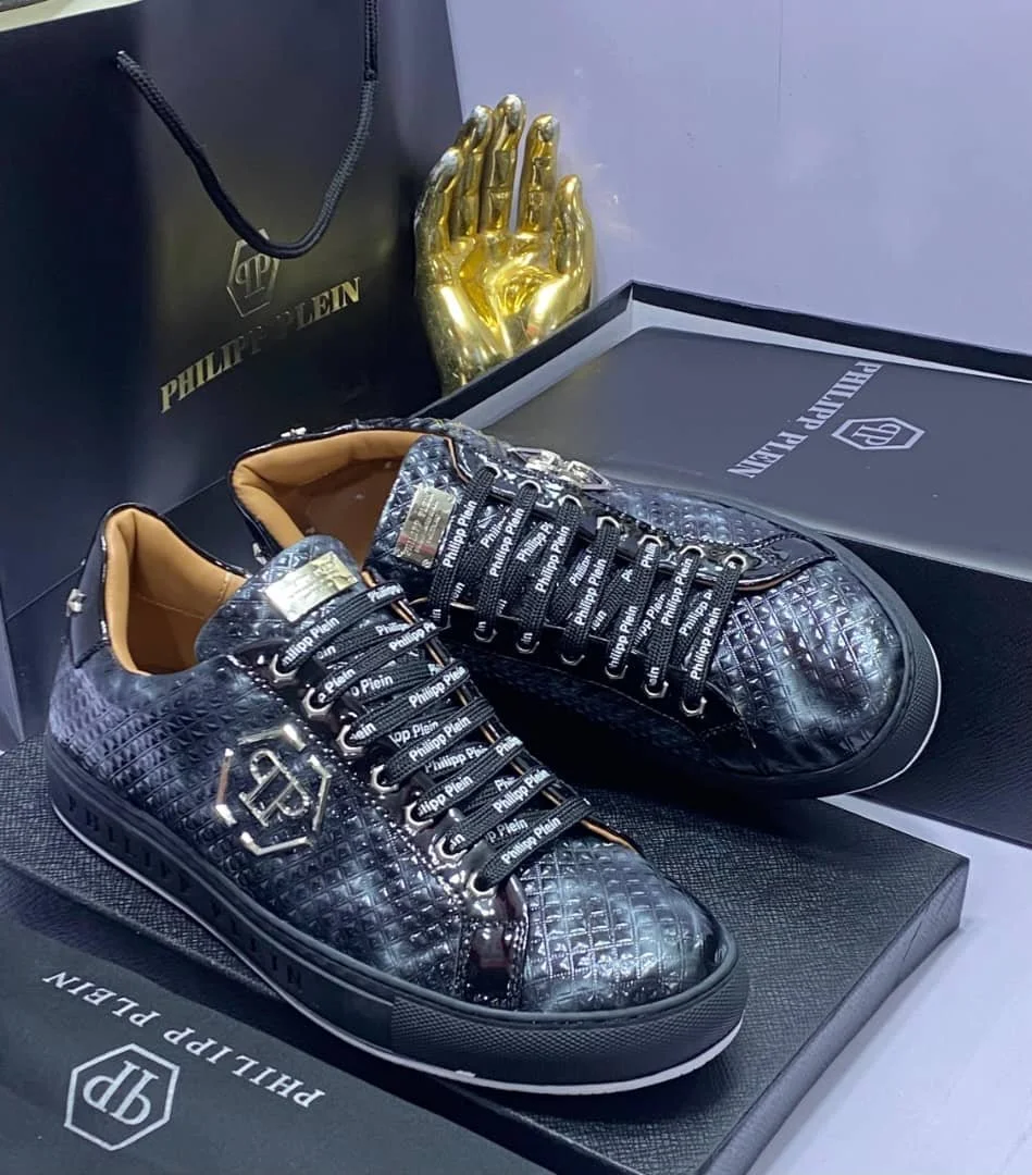 Phillip plien low top Italian leather designer shoes with PP Logo on sneaker.