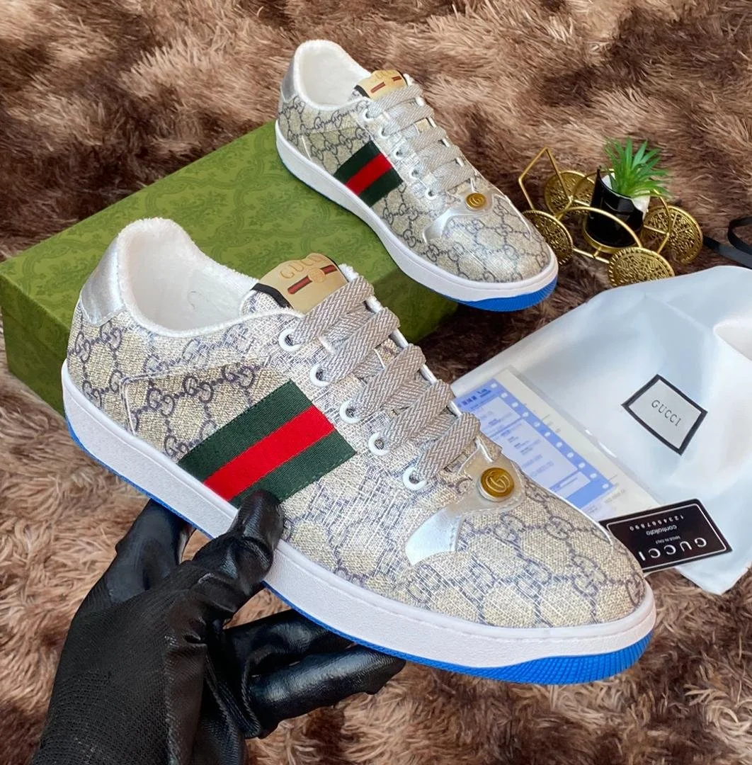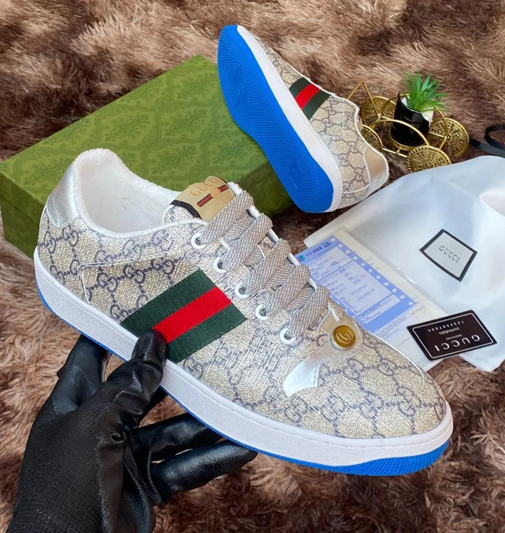 Gucci Italian leather GG Monogram Tan ;Gucci stripe royal blue sole comfortable walking sneaker Designer outerwear.