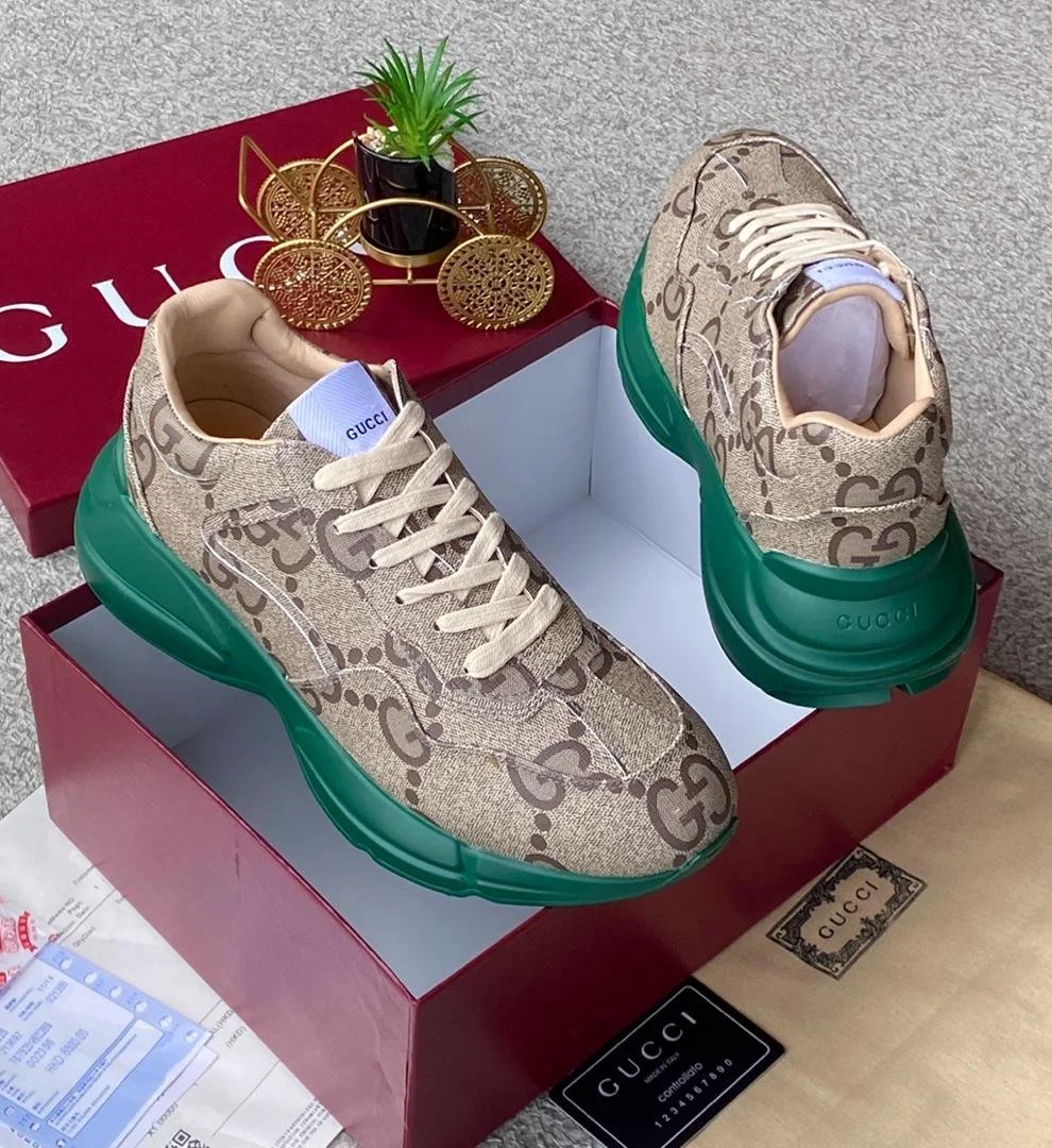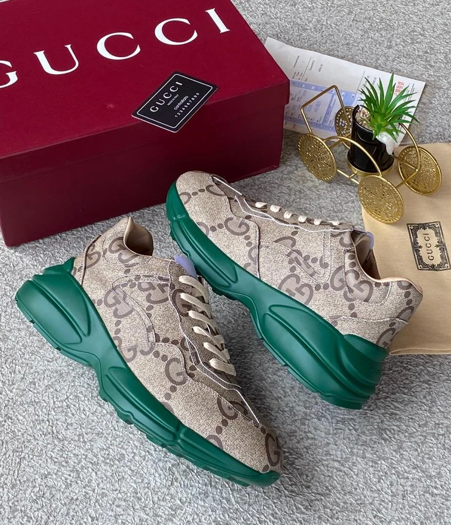Gucci Tan GG Monogram canvas stylish walking/running shoe Green Sole Italian leather quality sneaker.