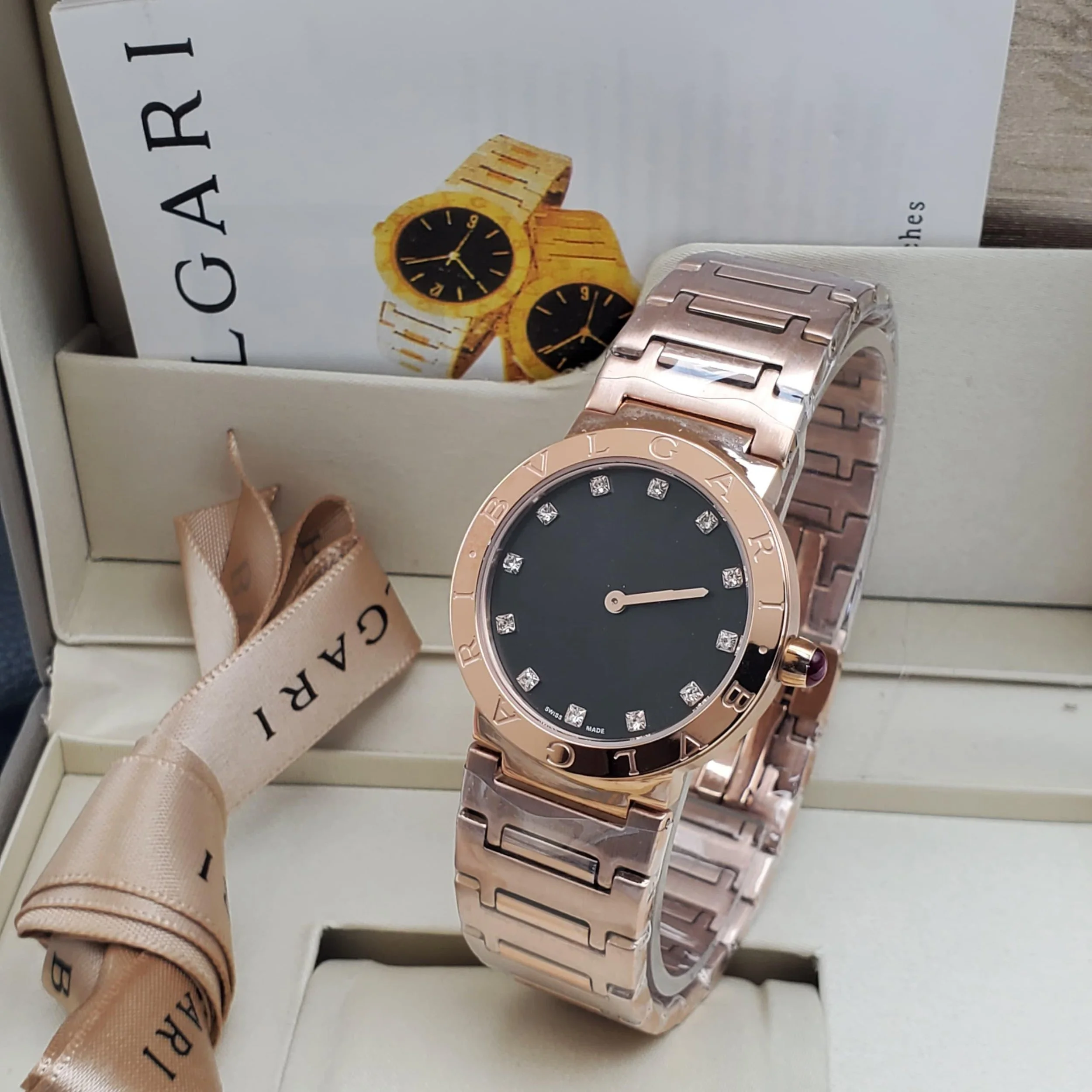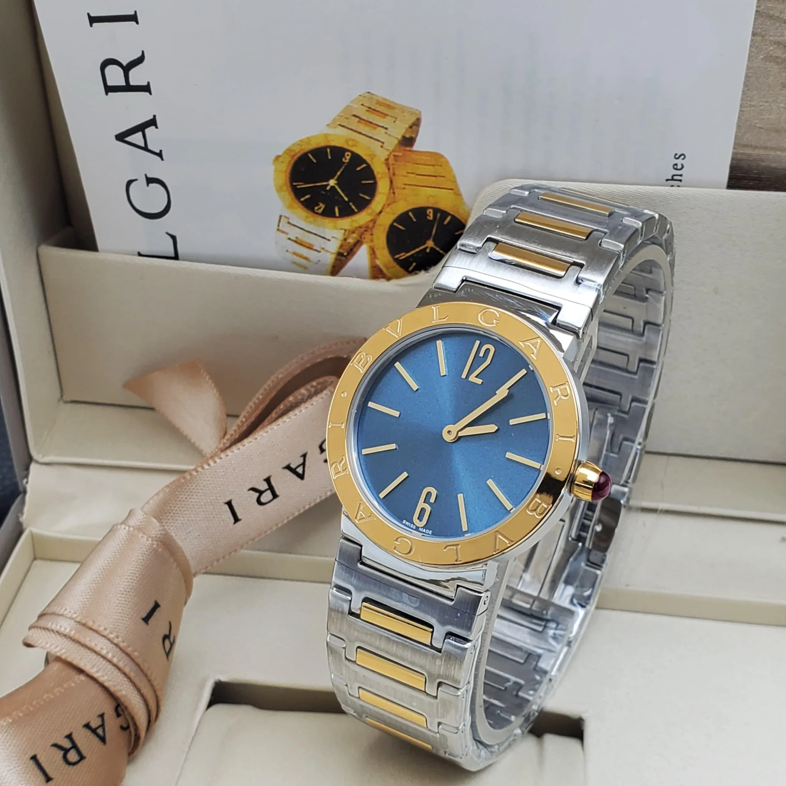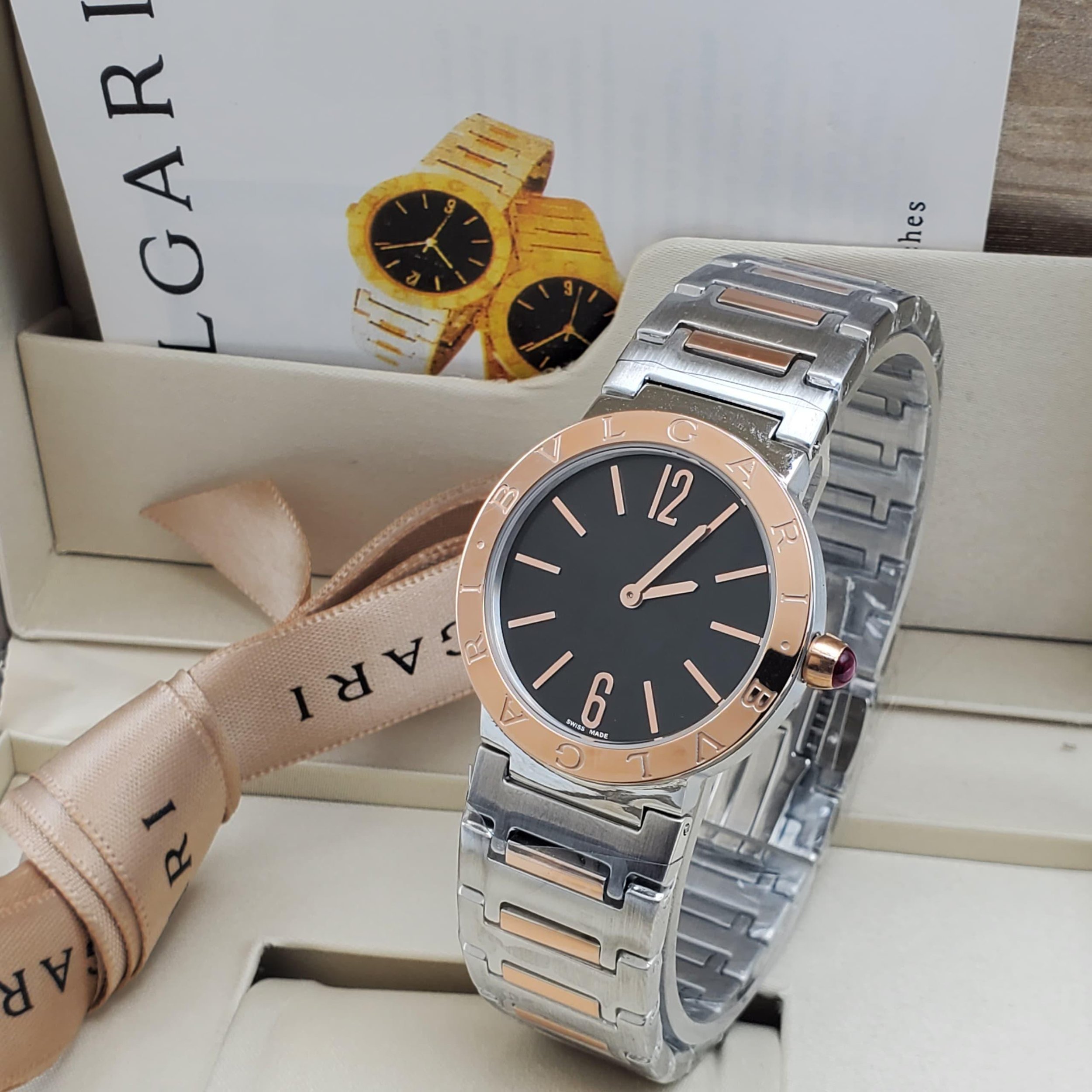 The Bulgari Bulgari wrist watch specifically a two-tone model featuring a stainless steel and 18k yellow gold design. The watch in your image share several key visual features with models from the iconic collection. Bezel/Dial/Bracelet/Bezzel