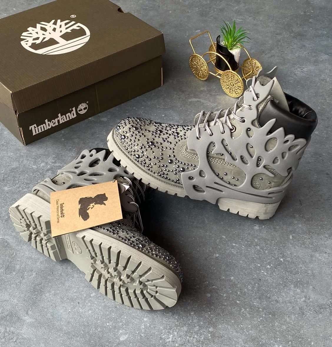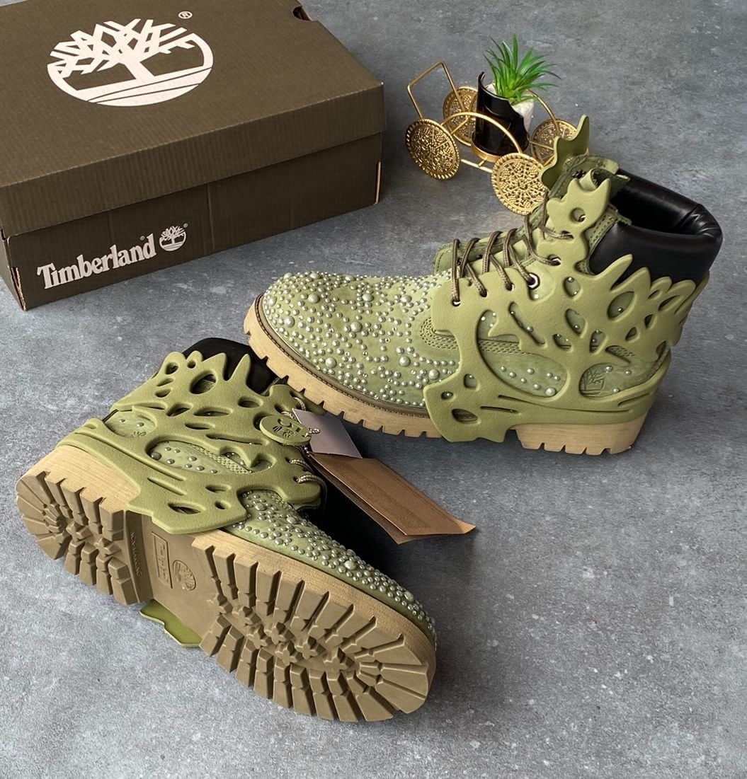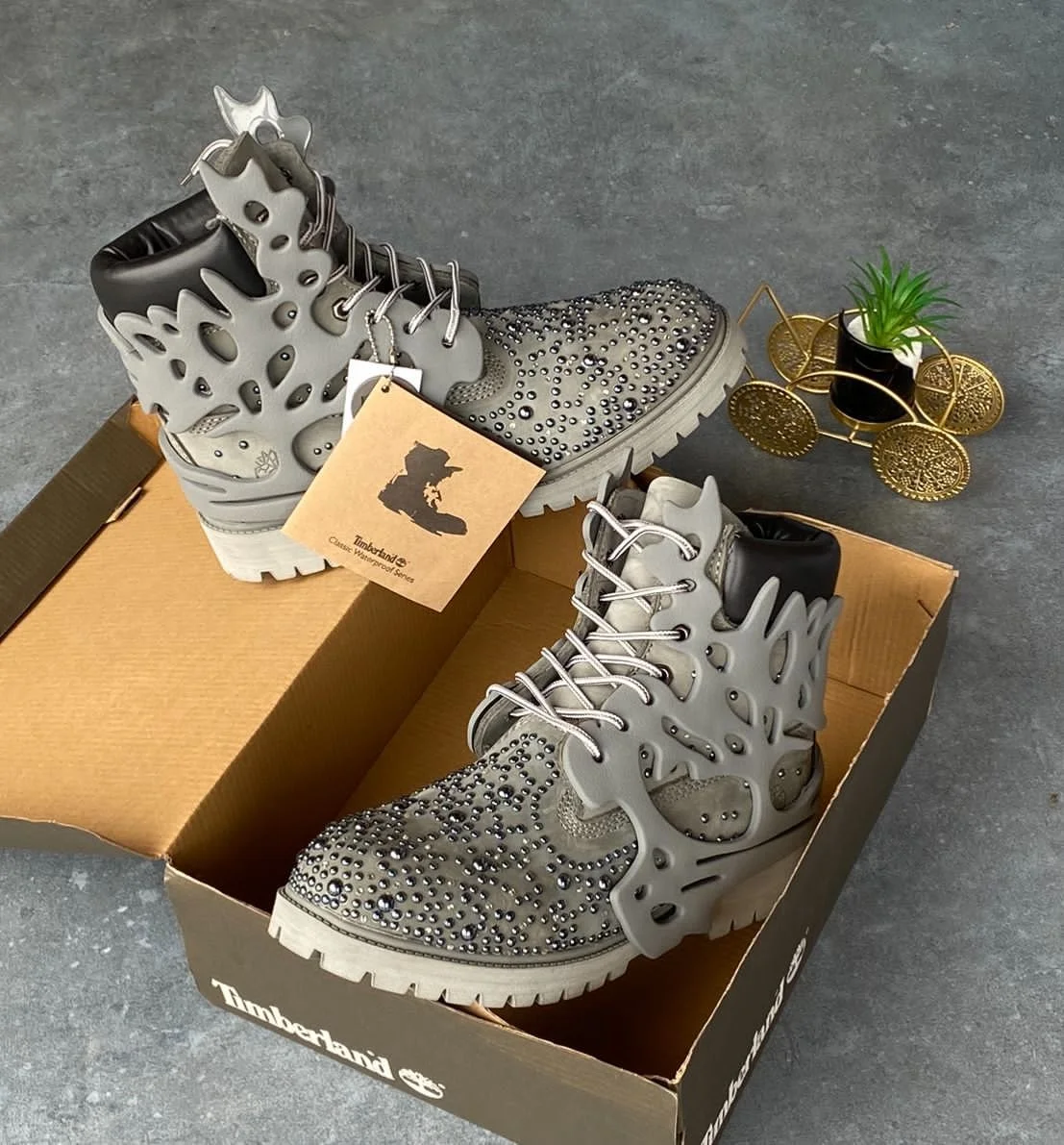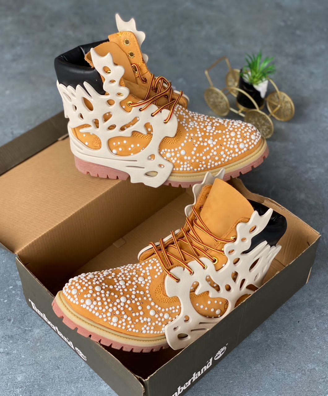 Beeline 🐝 Timberland Trending Designer Fashion boot Timberland logo tree trimming color of boot, bedazzled pearl white or Pearl coloring of boot RARE Designer Fashion 😍
