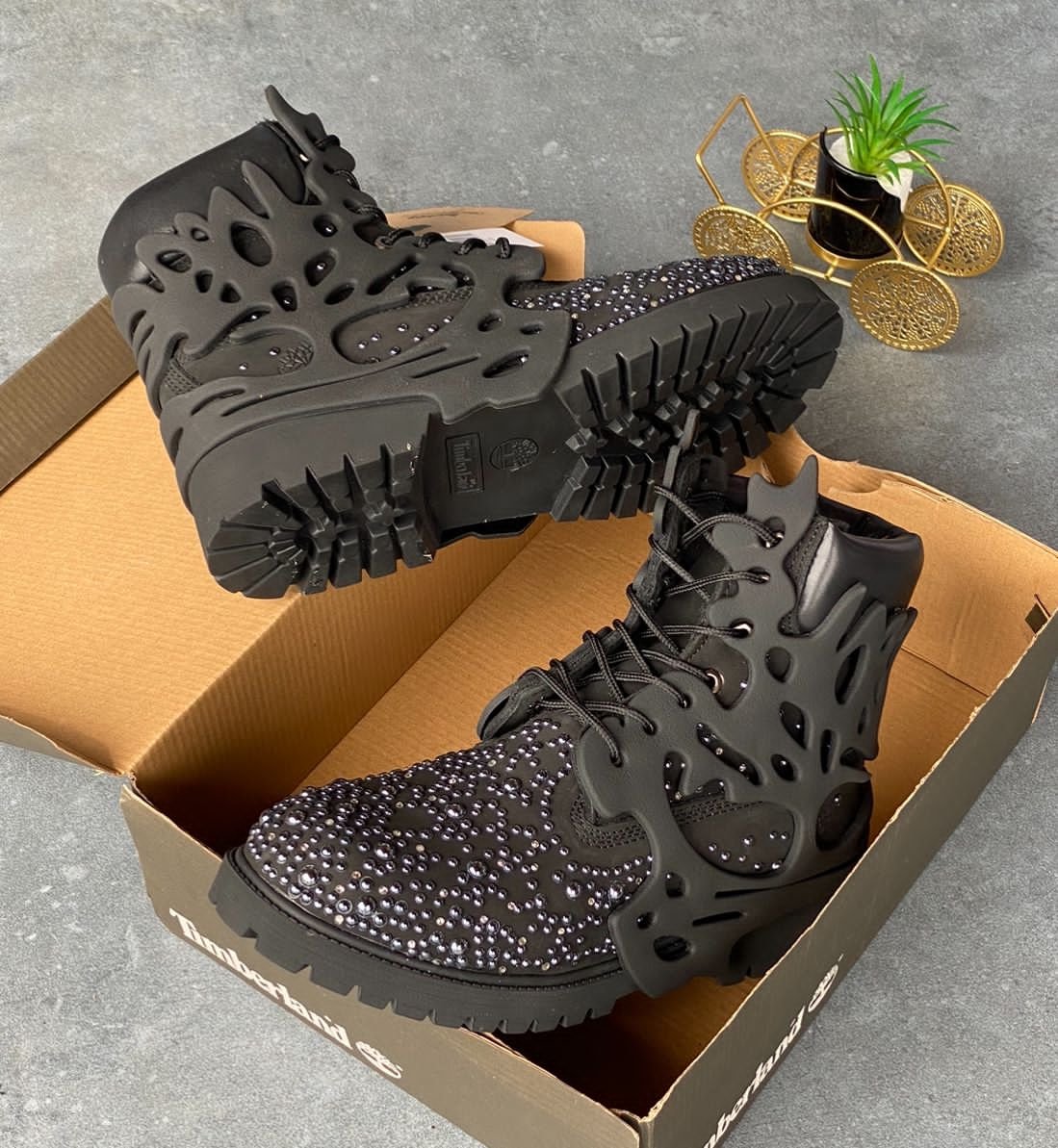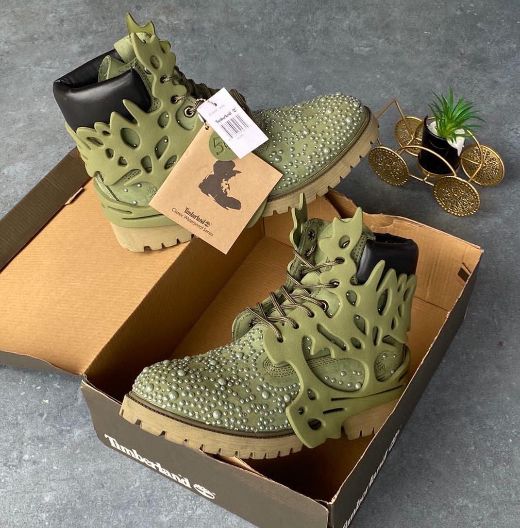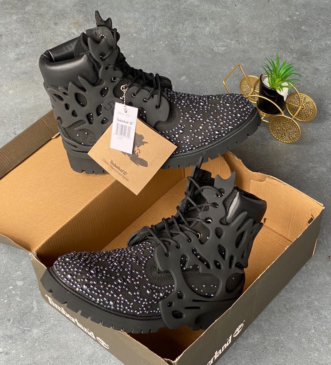 Beeline 🐝 Timberland Trending Designer Fashion boot Timberland logo tree trimming color of boot, bedazzled pearl white or Pearl coloring of boot RARE Designer Fashion 😍