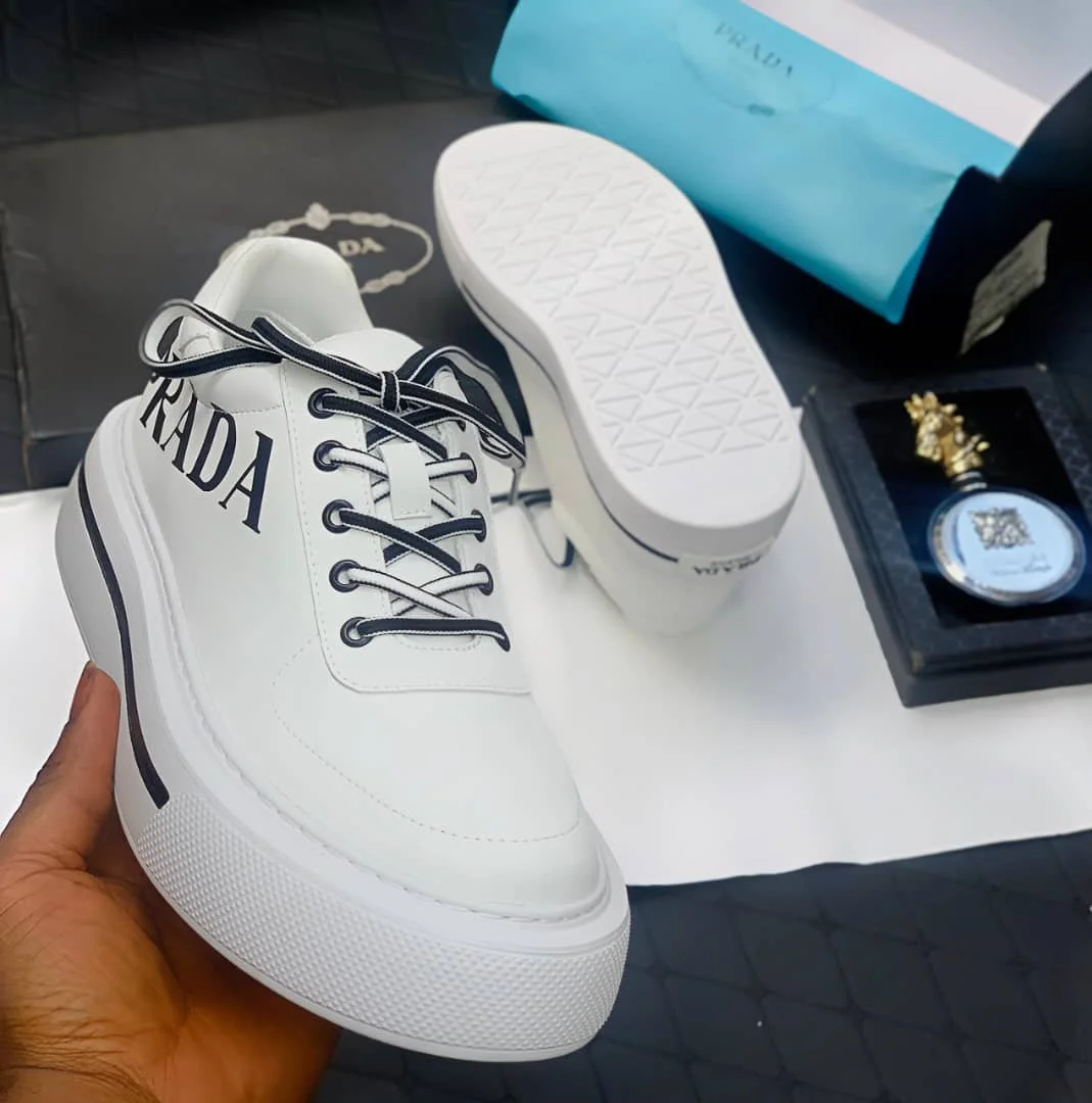 Prada Italian leather Lowtop white sneaker blk.lace flat style shoe Wht.,Blk