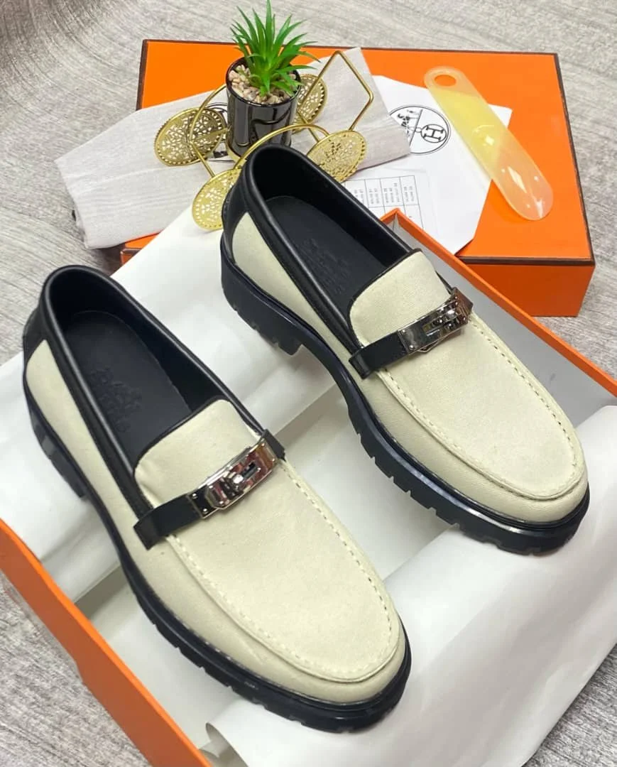 Hermes Loafers white Italian leather flat-style; silver buckling