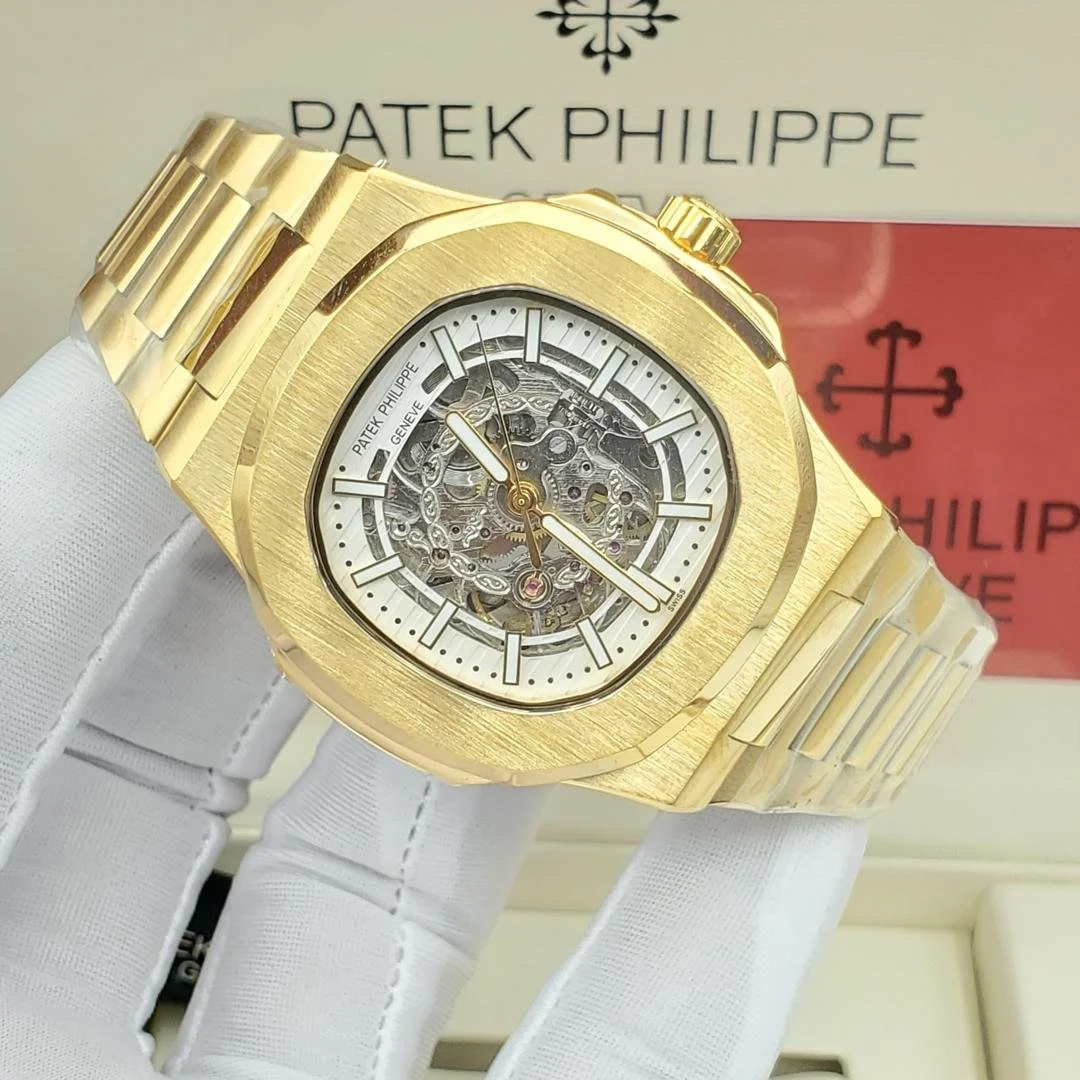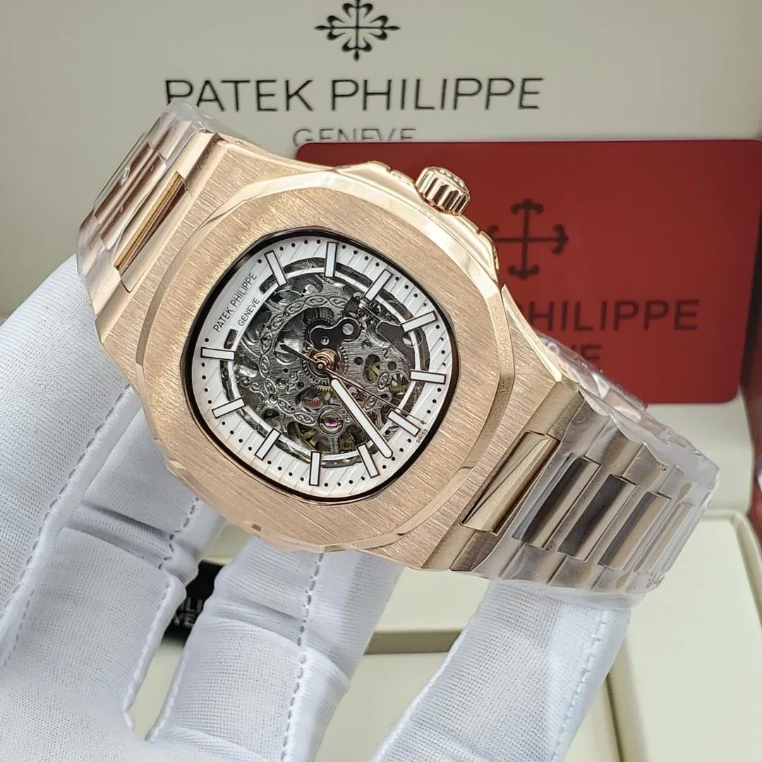 The timepieces feature are the patek Philippe Nautilus rose gold and stainless steel with a skeletonized open warped dial while padding for leave produces several rose gold medalist models they do not currently offer a standard production skeletonized version of the 5711 or the 5712 with this specific dial layout.