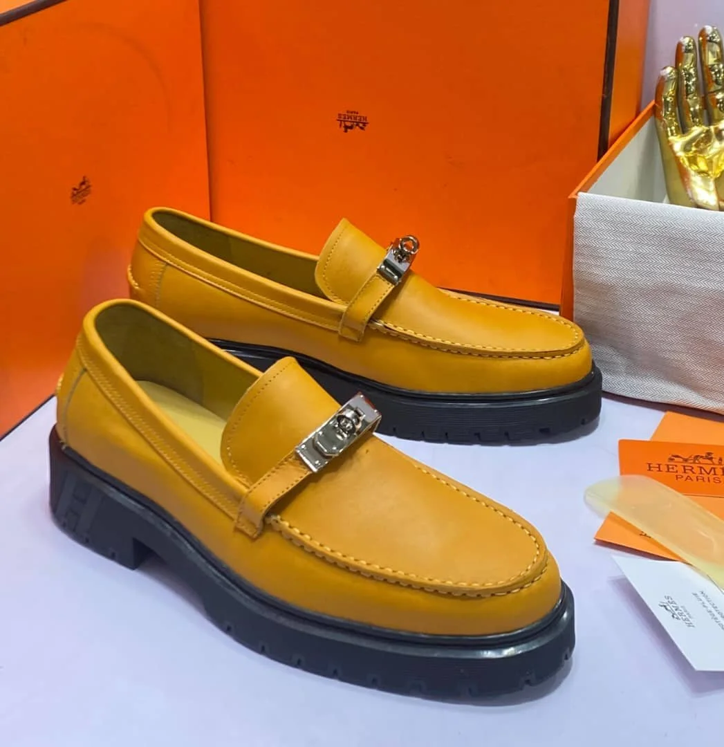 Hermes Loafer Italian leather flat shoe 💛🖤Yellow leather Blk. Bottom Fashion designer quality brand