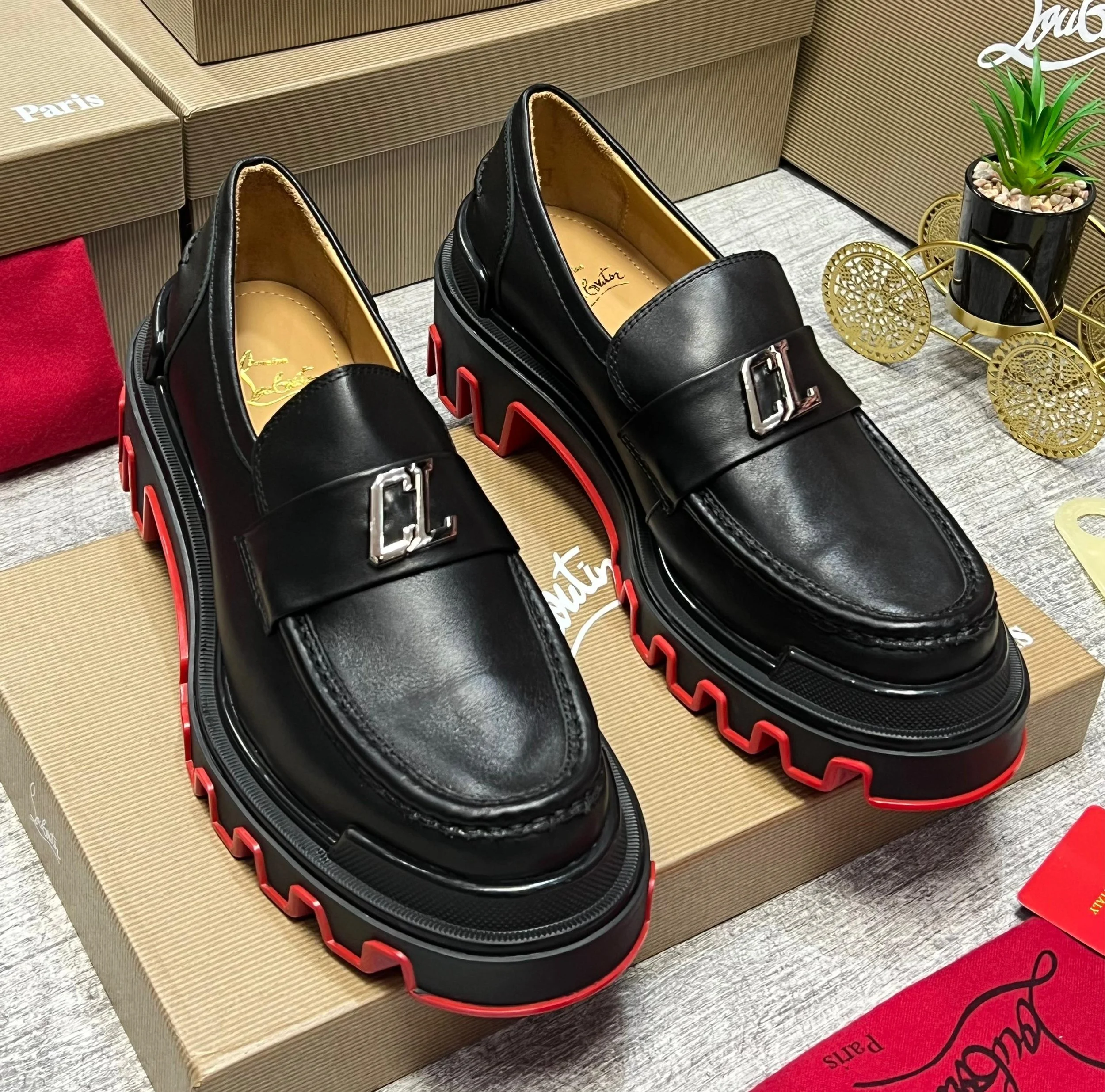 Christian Louboutian Loafers Red-Bottom Blk. Leather CL monogram silver Flat-style loafer.