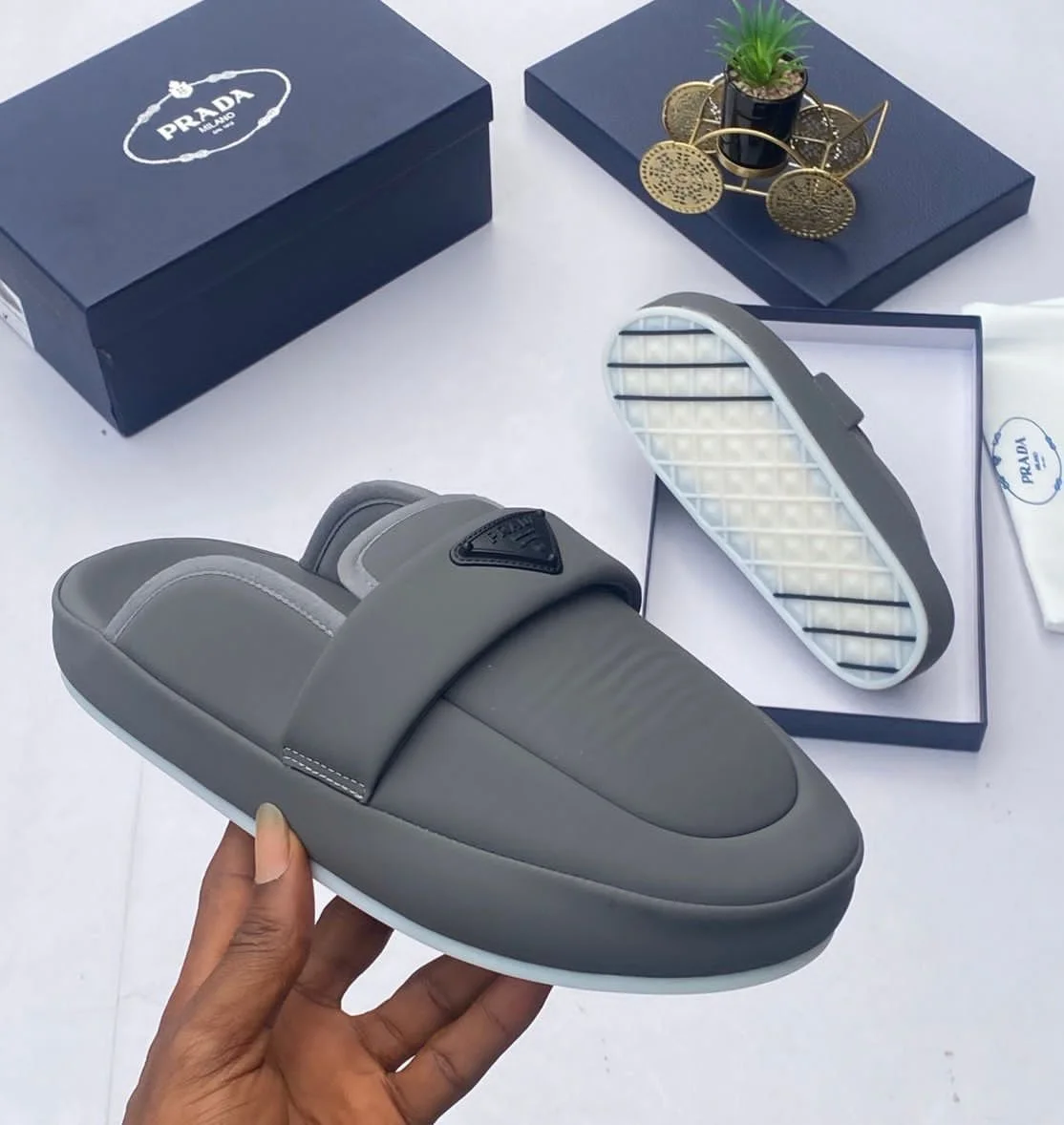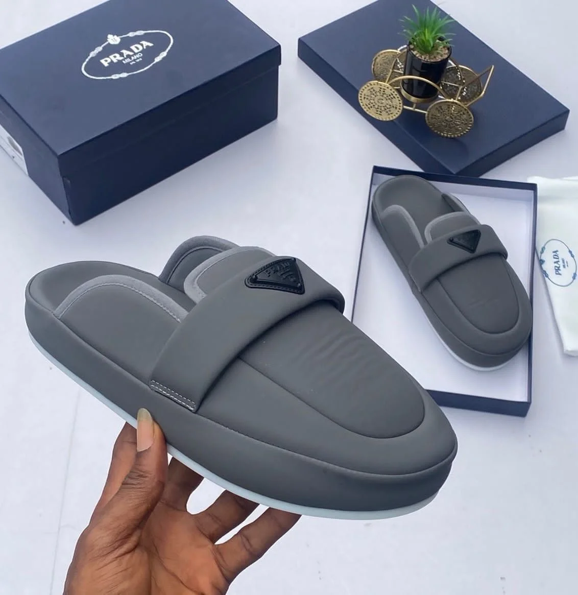 Elite Flight Designer Fashion Outlet › Prada Milano Half-mule slide Image 1 of 4 Image 2 of 4 Image 3 of 4 Image 4 of 4 Prada Milano Half-mule slide $329.99 Prada Milano Half-mule slide Available in 🩶 Grey 💙 NavyBlue Available Sizes//UK 39 --UK 46 Add To Cart Added! Prada Milano Half-mule slide Available in 🩶 Grey 💙 NavyBlue Available Sizes//UK 39 --UK 46
