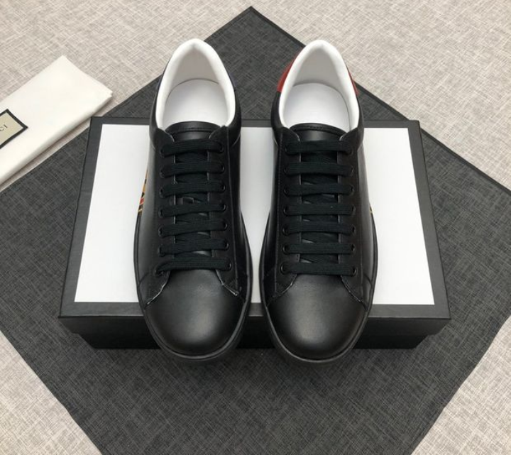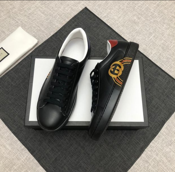 Black Gucci sneaker Italian leather shoe w/ gold GG pattern Blue,red shoe.