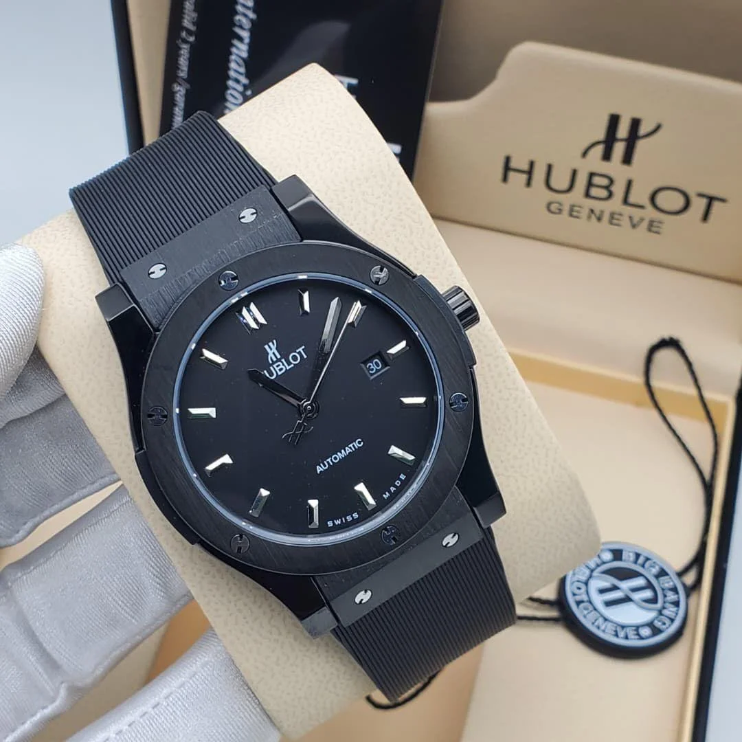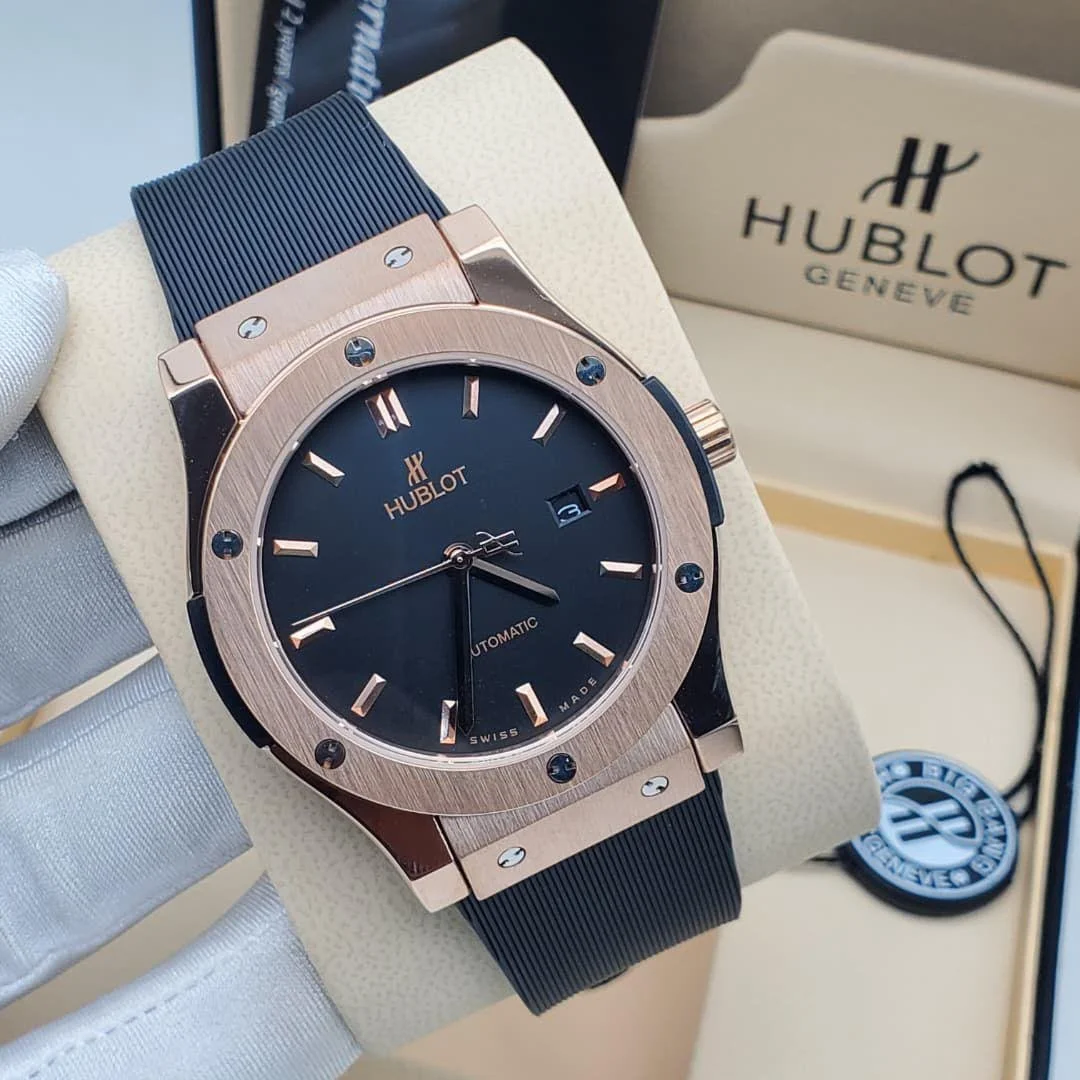 The Hublot Classic Fusion 42 mm Wristwatch features a 18K King Gold case and bezel,paired with a black rubber strap and a black dial.The Alloy is a warmer shade than traditional 5N gold and is exclusive to Hublot®️