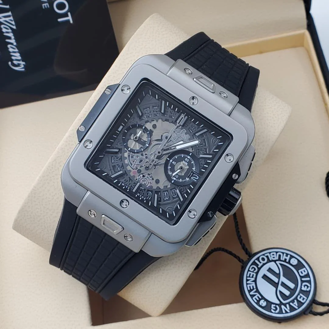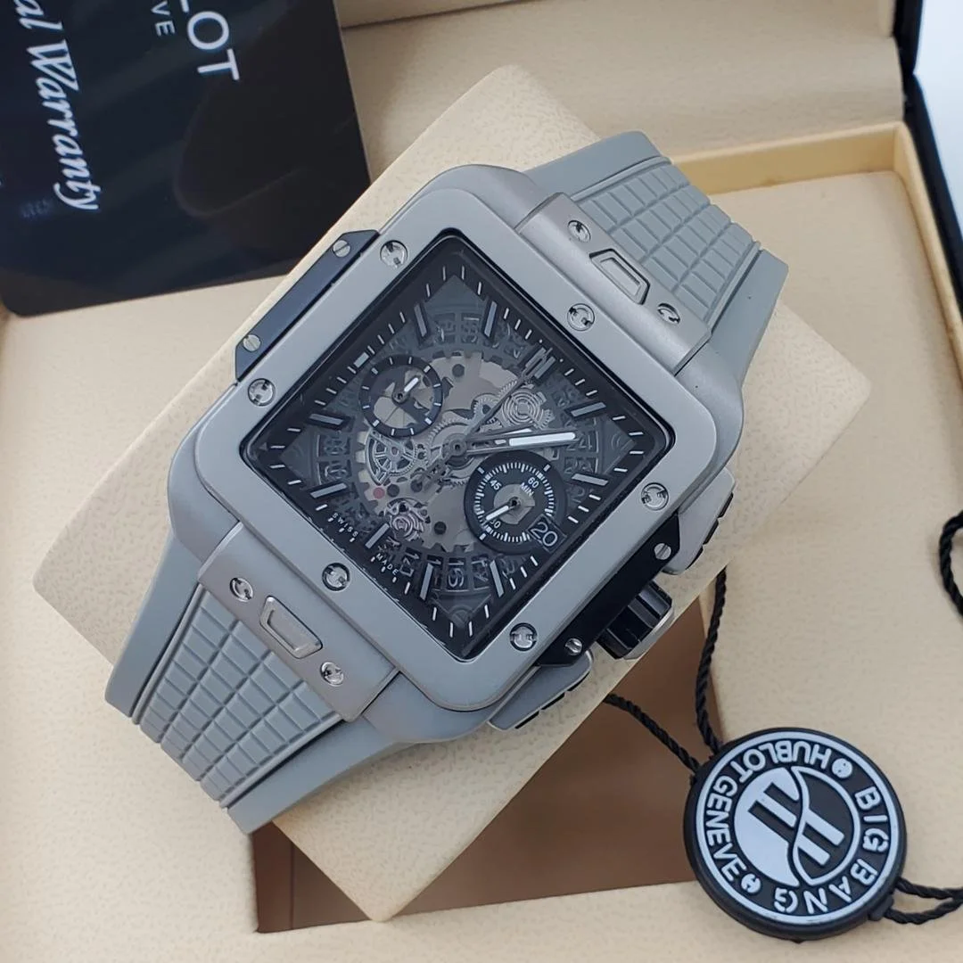 Hublot Big Bang Square a square shaped evolution of the brands iconic Big Bang Collection, features a 42 mm case with a distinct “sandwich” construction composed of multiple parts. It is powered by the HUB1280 UNICO manufacturer movement.